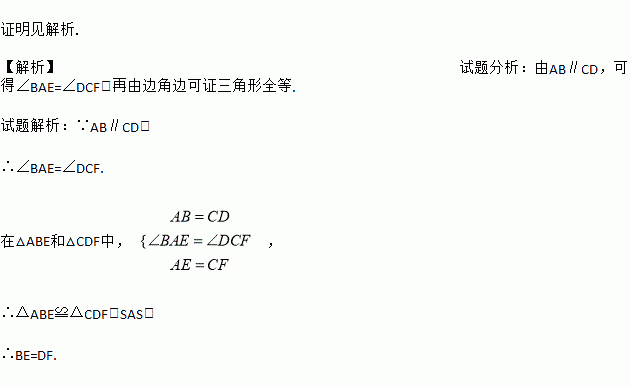 已知,如图,四边形ABCD中,E、F是对角线AC上两点,且 AE=CF,AB∥CD,AB=CD.求证:BE=DF
