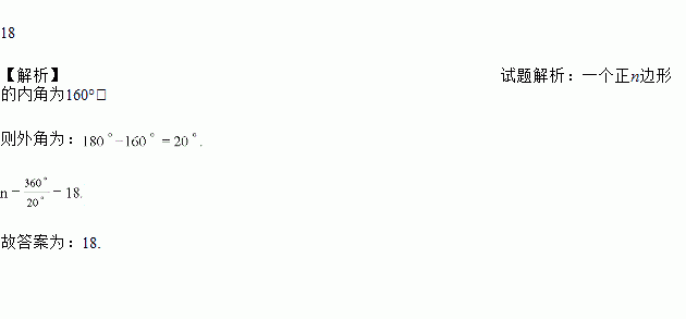 一个正n边形的内角为160°,则n的值为________.