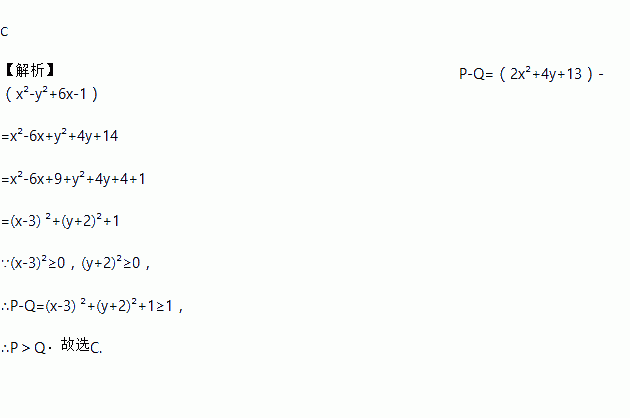 C 【解析】P-Q=(2x²+4y+13)-(x²-y²+6x-1) =x²-6x+y²+4y+14 =x²-6x+9+y²+4y+4+1 =(x-3) ²+(y+2)²+1 ∵(x-3)²≥0,(y+2)²≥0, ∴P-Q=(x-3) ²+(y+2)²+1≥1, ∴P>Q.故选C.