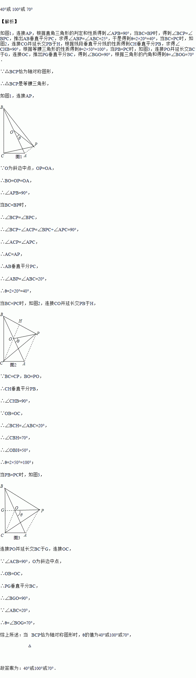 如图,在 Rt△ABC 中,C 为直角顶点,∠ABC=20°,O 为斜边的中点,将 OA 绕着点 O 逆时针旋转θ°(0<θ<180)至 OP,当△BCP 恰为轴对称图形时,θ的值为________________.