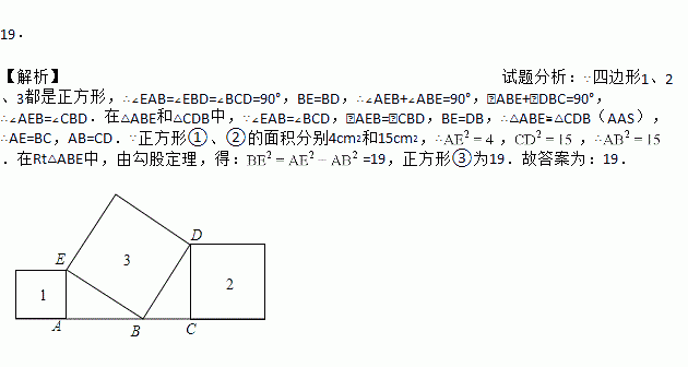 已知正方形①、②在直线上,正方形③如图放置,若正方形①、②的面积分别4cm2和15cm2,则正方形③的面积为 .