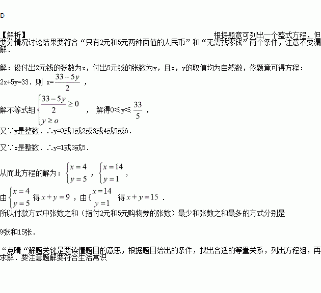 某种商品价格为33元/件,某人只带有2元和5元的两种面值的购物劵各若干张,买了一件这种商品;若无需找零钱,则付款方式中张数之和(指付2元和5元购物券的张数)最少和张数之和最多的方式分别是( )