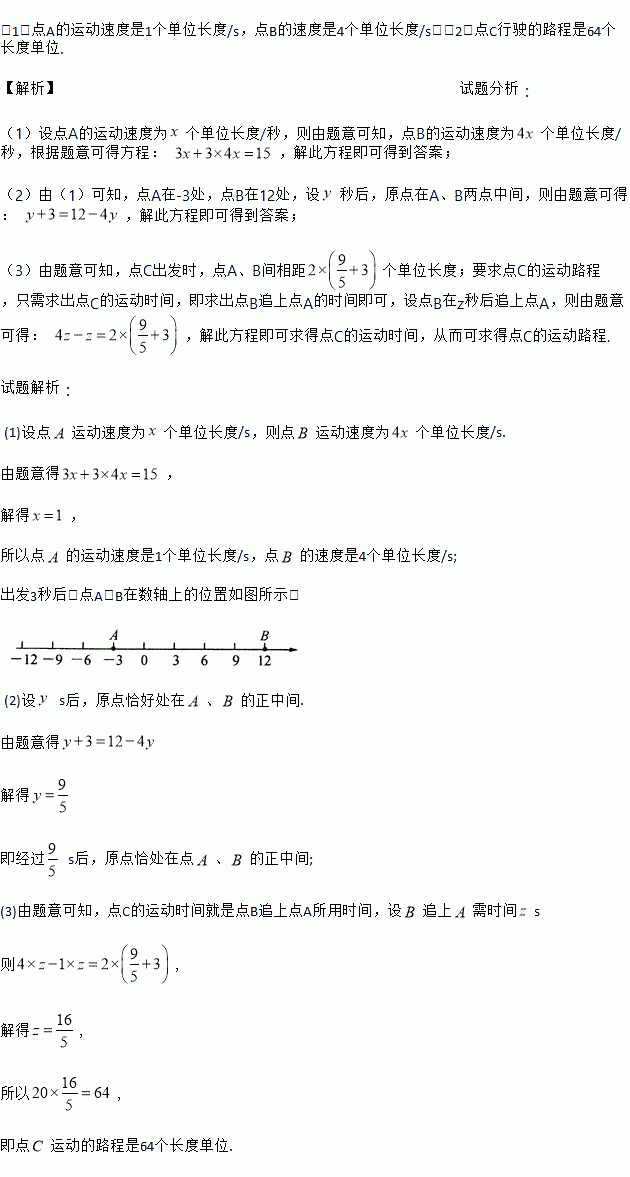 (1)点A的运动速度是1个单位长度/s,点B的速度是4个单位长度/s;(2)点C行驶的路程是64个长度单位. 【解析】试题分析: (1)设点A的运动速度为个单位长度/秒,则由题意可知,点B的运动速度为个单位长度/秒,根据题意可得方程: ,解此方程即可得到答案; (2)由(1)可知,点A在-3处,点B在12处,设秒后,原点在A、B两点中间,则由题意可得: ,解此方程即可得到答案; ...