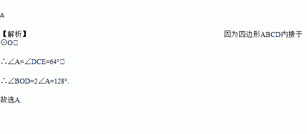 A 【解析】因为四边形ABCD内接于⊙O, ∴∠A=∠DCE=64°, ∴∠BOD=2∠A=128°. 故选A.