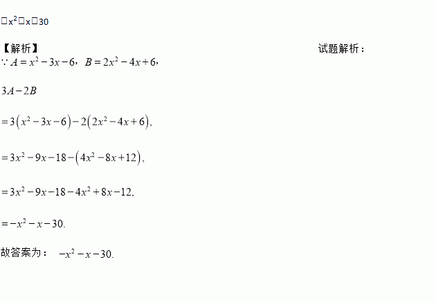 若A=x2-3x-6,B=2x2-4x+6,则3A-2B=_______