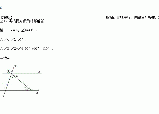 如图,直线a,b被直线c所截,若a∥b,∠1=40°,∠2=70°,则∠3=( )