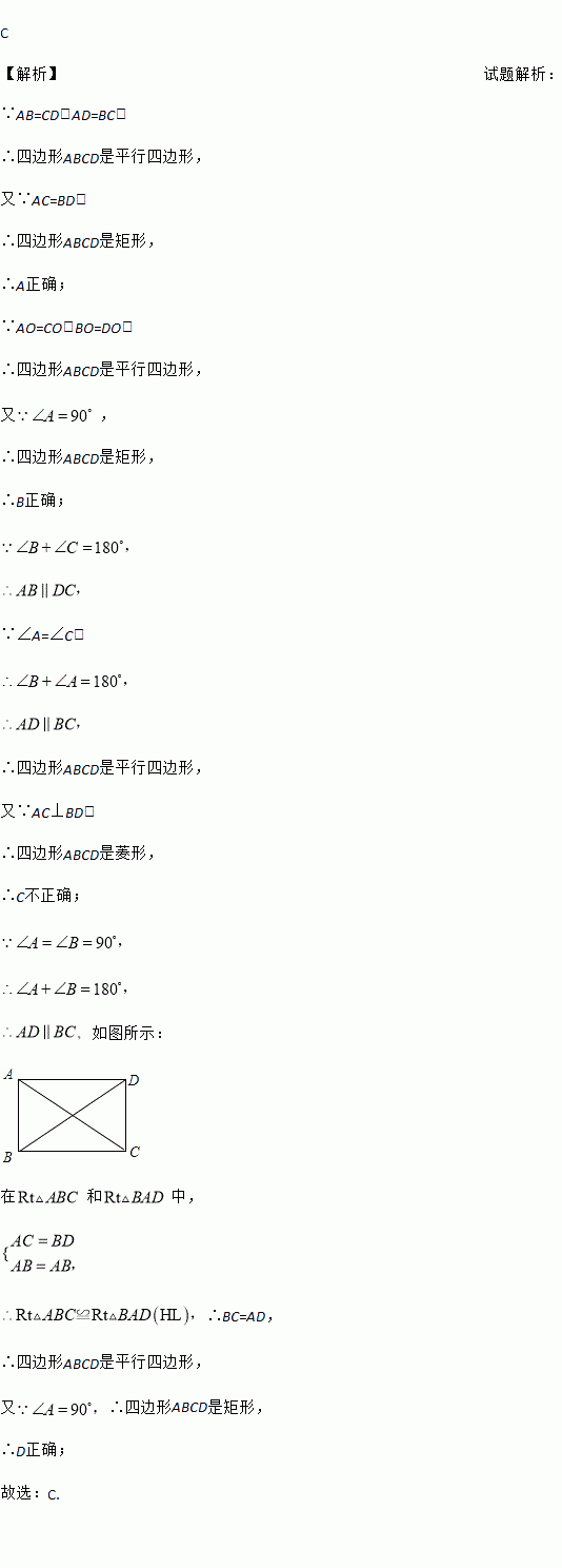 A. AB=CD,AD=BC,AC=BD B. AO=CO,BO=DO,∠A=90°