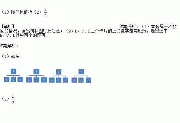 (1)请用树状图或列表的方法表示两次抽取卡片的所有可能出现的结果(卡片用A,B,C,D表示);