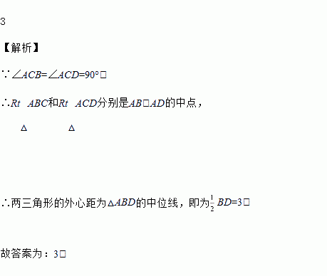 我们把两个三角形的外心之间的距离叫做外心距.如图,在Rt△ABC和Rt△ACD中,∠ACB=∠ACD=90°,点D在边BC的延长线上,如果BC=DC=3,那么△ABC和△ACD的外心距是 ________.