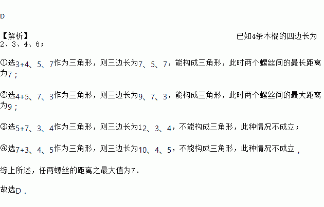 D 【解析】已知4条木棍的四边长为2、3、4、6; ①选3+4、5、7作为三角形,则三边长为7、5、7,能构成三角形,此时两个螺丝间的最长距离为7; ②选4+5、7、3作为三角形,则三边长为9、7、3,能构成三角形,此时两个螺丝间的最大距离为9; ③选5+7、3、4作为三角形,则三边长为12、3、4,不能构成三角形,此种情况不成立; ④选7+3、4、5作为三角形,则三...
