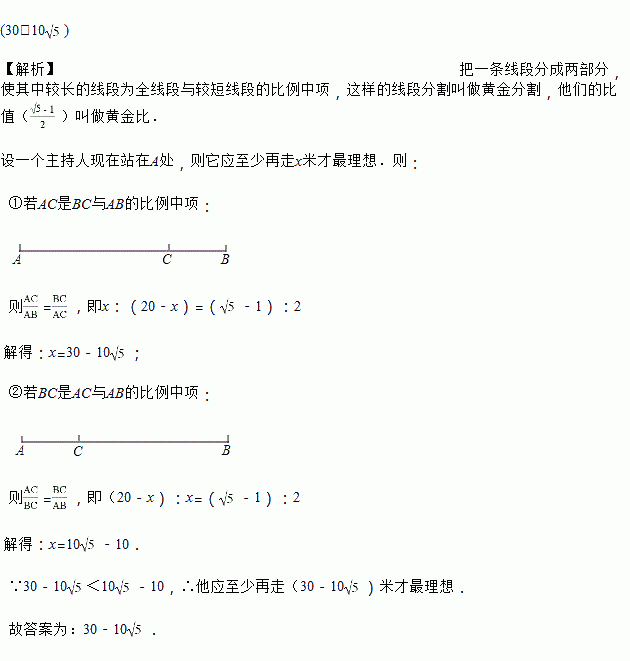 一个主持人站在舞台的黄金分割点处最自然得体,如果舞台AB长为20米,一个主持人现在站在A处,那么他应至少再走________米才最理想.