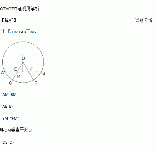 如图所示,AB是⊙O的弦,半径OC、OD分别交AB于点E、F,且AE=BF,请你找出线段OE与OF的数量关系,并给予证明.