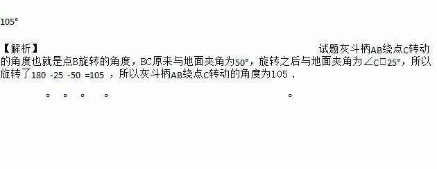 如图1,教室里有一只倒地的装垃圾的灰斗,BC与地面的夹角为50°,∠C=25°,小贤同学将它扶起平放在地上(如图2),则灰斗柄AB绕点C转动的角度为_________.