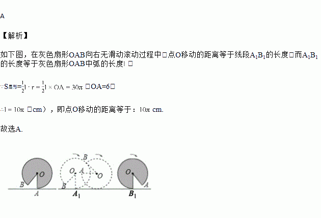 如图,水平地面上有一面积为30cm2的灰色扇形OAB,其中OA=6cm,且OA垂直于地面.将这个扇形向右滚动(无滑动)至点B刚好接触地面为止,则在这个滚动过程中,点O移动的距离是( )![]()
