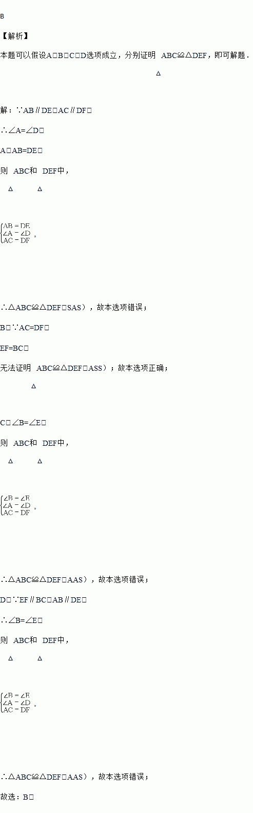 如图,AB//DE,AC//DF,AC=DF,下列条件中不能判断△ABC≌△DEF的是( )
