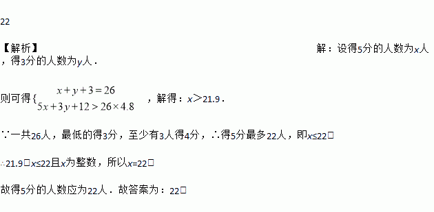 一次测验共出5道题,做对一题得一分,已知26人的平均分不少于分,最低的得3分,至少有3人得4分,则得5分的有______ 人