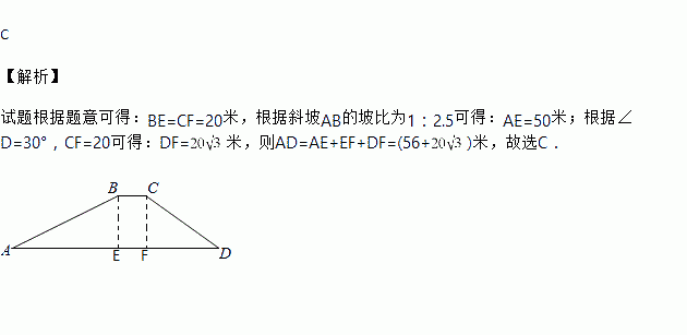如图,一水库大坝的横断面为梯形ABCD,坝顶BC宽6米,坝高20米,斜坡AB的坡度i=1:2.5,斜坡CD的坡角为30度,则坝底AD的长度为( )