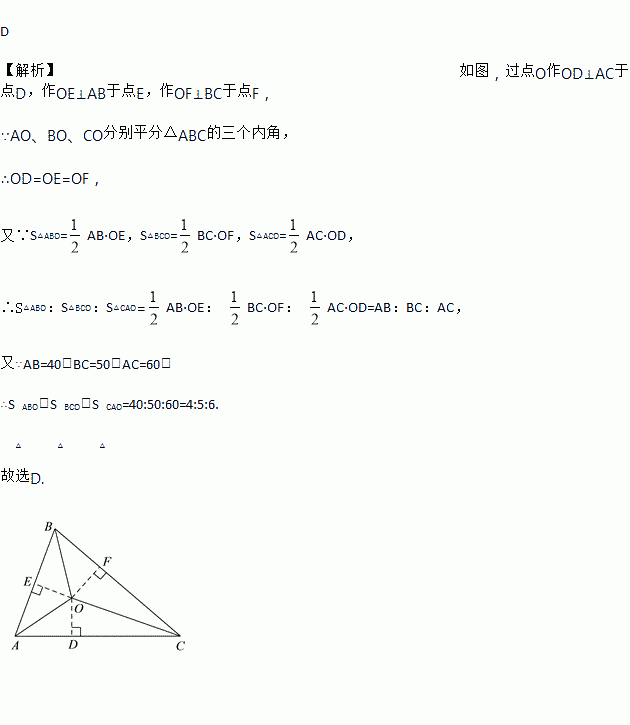 D 【解析】如图,过点O作OD⊥AC于点D,作OE⊥AB于点E,作OF⊥BC于点F, ∵AO、BO、CO分别平分△ABC的三个内角, ∴OD=OE=OF, 又∵S△ABO=AB·OE,S△BCO=BC·OF,S△ACO=AC·OD, ∴S△ABO:S△BCO:S△CAO=AB·OE: BC·OF: AC·OD=AB:BC:AC, 又∵AB=40,BC=50,AC...