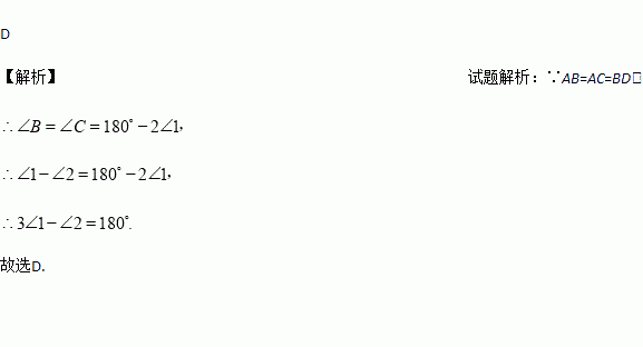 如图,已知AB=AC=BD,则∠1与∠2的大小关系是( )