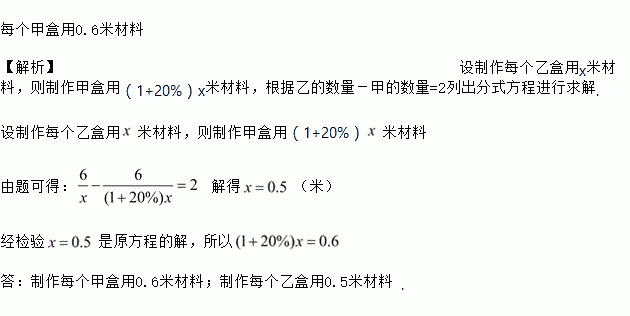 某厂制作甲、乙两种环保包装盒。已知同样用6m的材料制成甲盒的个数比制成乙盒的个数少2个,且制成一个甲盒比制作一个乙盒需要多用20%的材料。