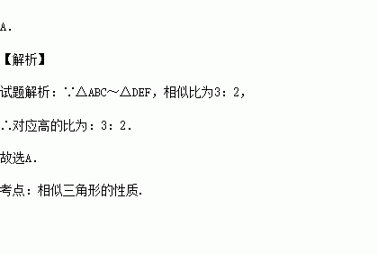 若△ABC~△DEF,相似比为3:2,则对应高的比为( )