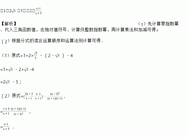 (1)计算:π0+2cos30°﹣|2﹣|﹣()﹣2;