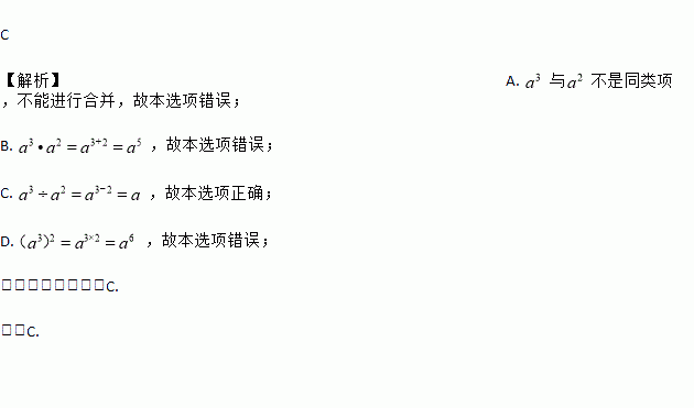 A. a3﹣a2=a B. a3•a2=a6 C. a3÷a2=a D. (a3)2=a5
