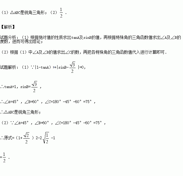已知△ABC中的∠A与∠B满足(1-tanA)2+|sinB-|=0