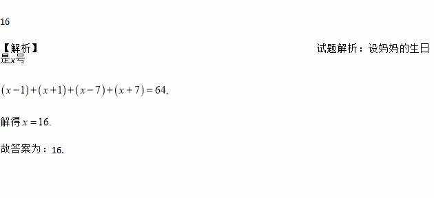 每星期占一行的挂历上,小明妈妈生日那天的上、下、左、右四个日期的和是64,则妈妈的生日是___________号.