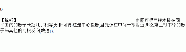 某时刻两根木棒在同一平面内的影子如图所示,此时,第三根木棒的影子表示正确的是( )