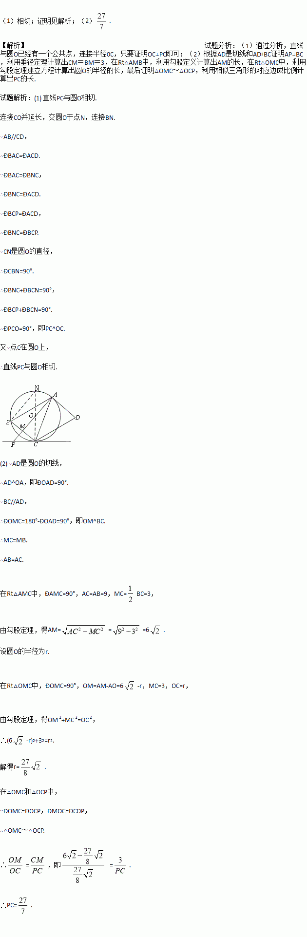 如图,AD是圆O的切线,切点为A,AB是圆O的弦。过点B作BC//AD,交圆O于点C,连接AC,过点C作CD//AB,交AD于点D。连接AO并延长交BC于点M,交过点C的直线于点P,且?BCP=?ACD。