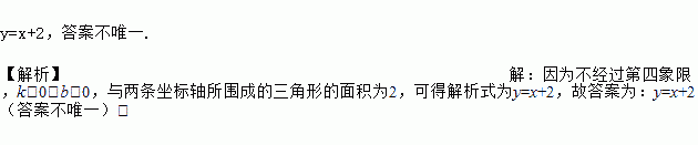 y=x+2,答案不唯一. 【解析】【解析】 因为不经过第四象限,k>0,b>0,与两条坐标轴所围成的三角形的面积为2,可得解析式为y=x+2,故答案为:y=x+2(答案不唯一).
