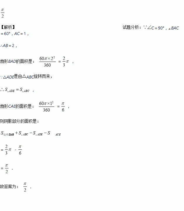 (2016·贵港中考)如图,在Rt△ABC中,∠C=90°,∠BAC=60°,将△ABC绕点A逆时针旋转60°后得到△ADE.若AC=1,则线段BC在上述旋转过程中所扫过部分(阴影部分)的面积是________(结果保留π).