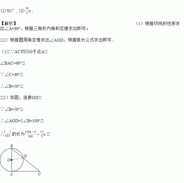 如图,AB是⊙O的直径,AC切⊙O于点A,BC交⊙O于点D.已知⊙O的半径为6,∠C=40°.