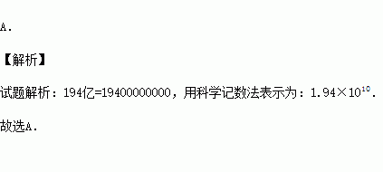 在我国南海某海域探明可燃冰储量约有194亿立方米.194亿用科学记数法表示为( )