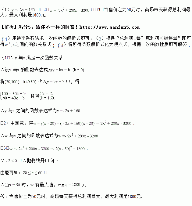 (2)设商场每天获得的总利润为w(元),求w与x之间的函数关系式;