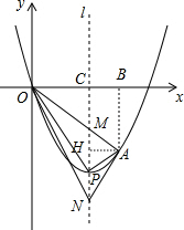 (3)过点A作AB⊥x轴于点B,AH⊥l于点H,l与x轴交于点C,如图,根据二次函数图象上点的坐标特征,设 A(m,m2-4m),则 H(2,m2-4m),B(m,0),C(2,0),通过证明△OCM∽△OBA,可求出CM=-2m+8,得到M(2,2m-8),再利用点M、N关于点P对称得到N(2,-2m),接着计算出$\frac{OC}{NC}$=$\frac{1}{m}$,$\frac{AH}{NH}$=$\frac{1}{m}$,即有$\frac{OC}{NC}$=$\frac{AH}{NH}$,根据相似三角形的判定方法得到△OCN∽△AHN,然后根据相似三角形的性质即可得到结论.