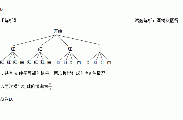 一个布袋里装有4个只有颜色不同的球,其中3个红球,1个白球,从布袋里摸出1个球,记下颜色后放回,搅匀,再摸出1个球,则两次摸到的球,都是红球的概率是( )