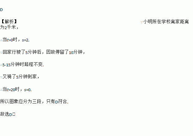 小强所在学校离家距离为2千米,某天他放学后骑自行车回家,先骑了5分钟后,因故停留10分钟,再继续骑了5分钟到家.下面哪一个图象能大致描述他回家过程中离家的距离s(千米)与所用时间t(分)之间的关系( )