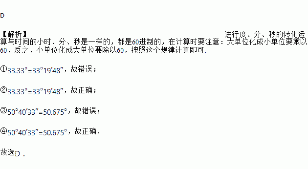 下列算式:①33.33°=33°3'3″;②33.33°=33°19'48″;③50°40'33″=50.43°;④50°40'33″≈50.676°.其中正确的是( )