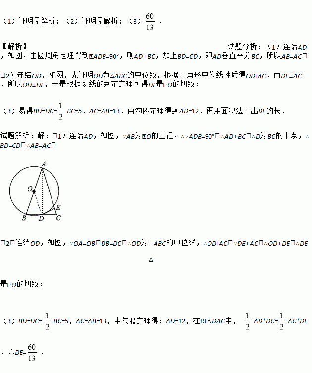 (3)若AB=13,BC=10,求DE的长