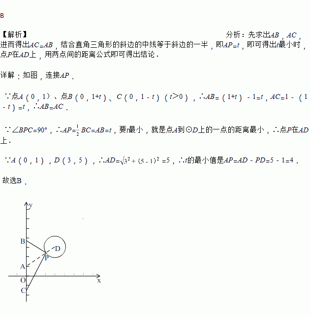 如图,在平面直角坐标系中,已知点A(0,1)、点B(0,1+t)、C(0,1﹣t)(t>0),点P在以D(3,5)为圆心,1为半径的圆上运动,且始终满足∠BPC=90°,则t的最小值是( )