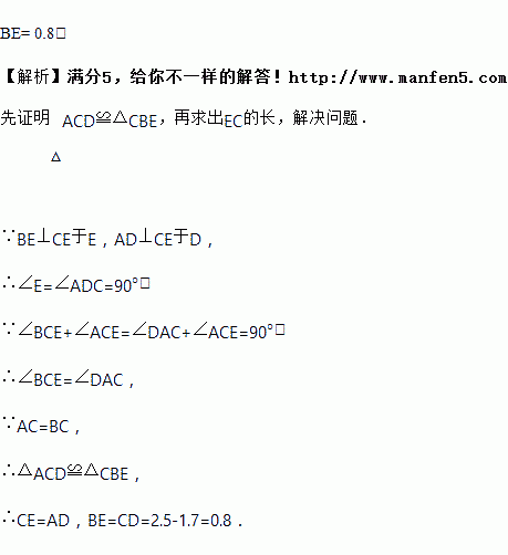 如图,在△ABC 中,∠ACB=90°,AC=BC,BE⊥CE 于 E,AD⊥CE 于 D,AD=2.5,DE=1.7, 求 BE 的长.