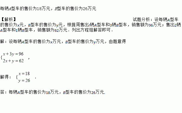 某汽车专卖店销售A,B两种型号的新能源汽车.上周售出I辆A型车和3辆B型车,销售额为96万元;本周已售出2辆A型车和1辆B型车,销售额为62万元.求每辆A型车和B型车的售价各为多少元.