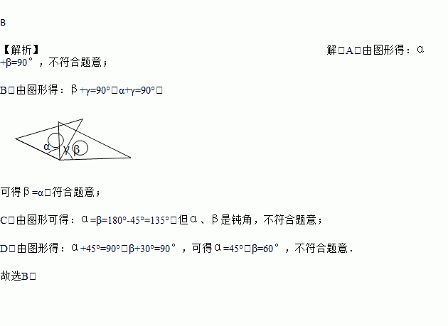 将一副直角三角尺按如图所示的不同方式摆放,则图中锐角∠α与∠β相等的是( )