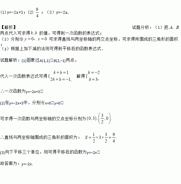(1)y=-2x+3;(2) ;(3)y=-2x. 【解析】试题分析:(1)把两点代入可求得的值,可得到一次函数的表达式; (2)分别令可求得直线与两坐标轴的两交点坐标,可求得所围成的三角形的面积; (3)根据上加下减的法则可得到平移后的函数表达式. 试题解析:(1)图象过A(1,1)、B(2,?1)两点, 代入一次函数表达式可得 解得 ∴一次函数为y=?2x+3; ...