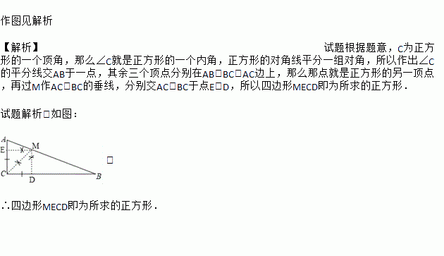 如图,已知△ABC,∠C=90°.请用尺规作一个正方形,使C为正方形的一个顶角,其余三个顶点分别在AB、BC、AC边上.(保留作图痕迹,不写作法)