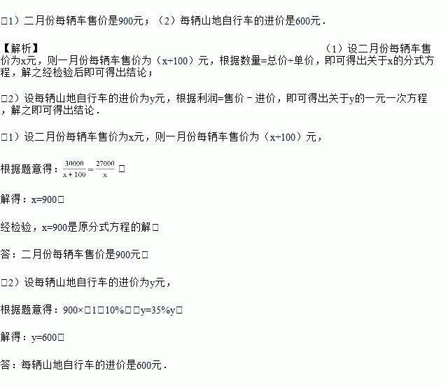 (2)为了促销,三月份每辆车售价比二月份每辆车售价降低了10%销售,网店仍可获利35%,求每辆山地自行车的进价是多少元?