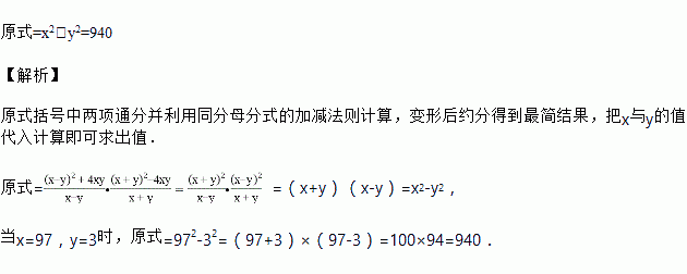 化简求值:(x﹣y+)(x+y﹣),其中x=97,y=3.