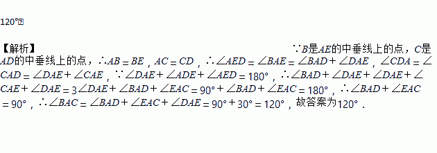 如图,在△DAE中,∠DAE=30°,线段AE,AD的中垂线分别交直线DE于B和C两点,则∠BAC的大小是______.